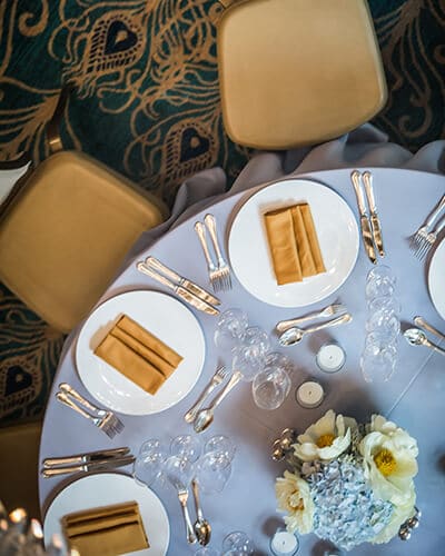 - White orchid stems rise high above the table, so as not to disturb the guests either
